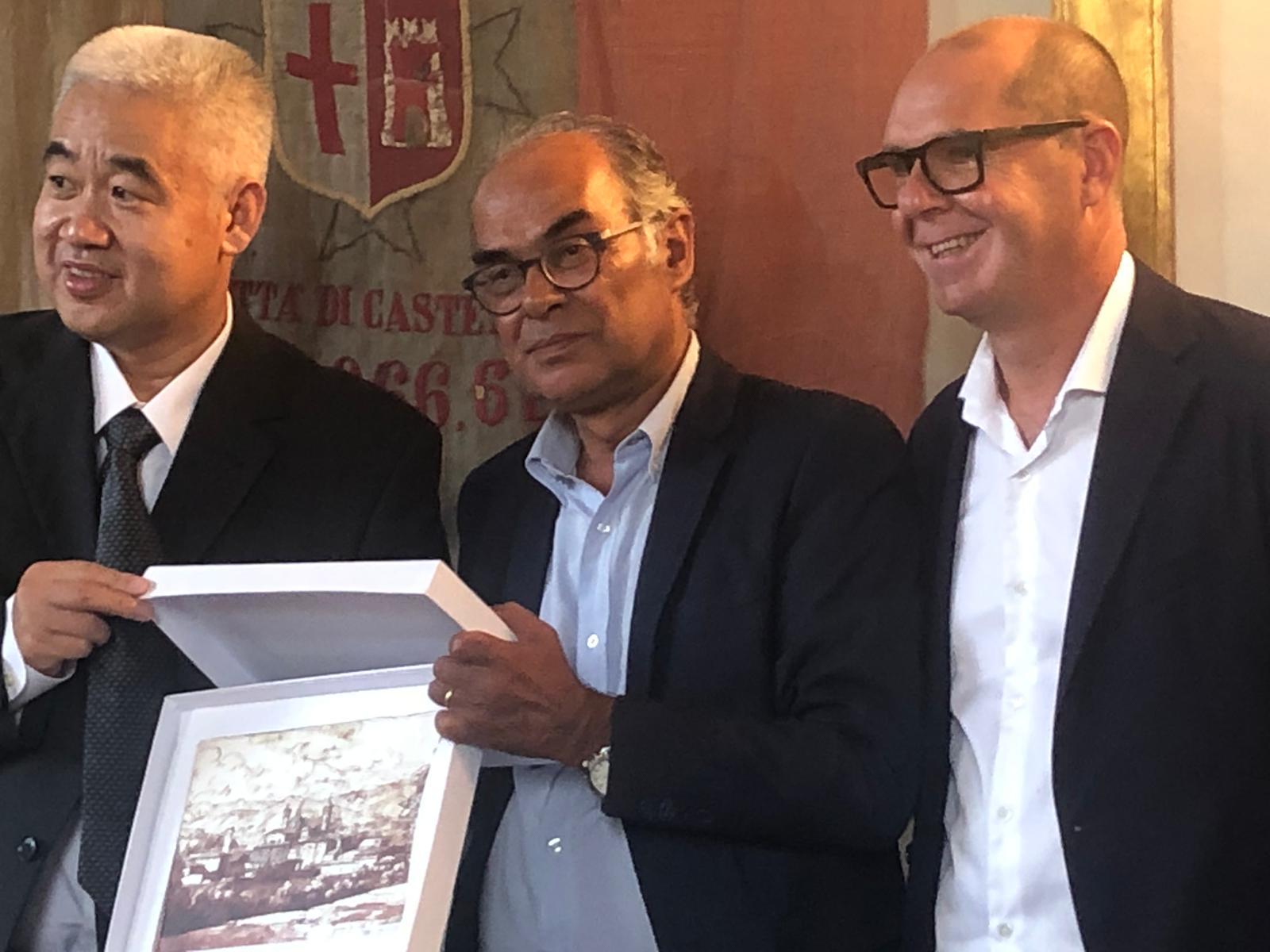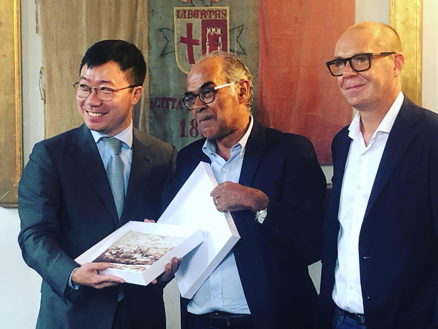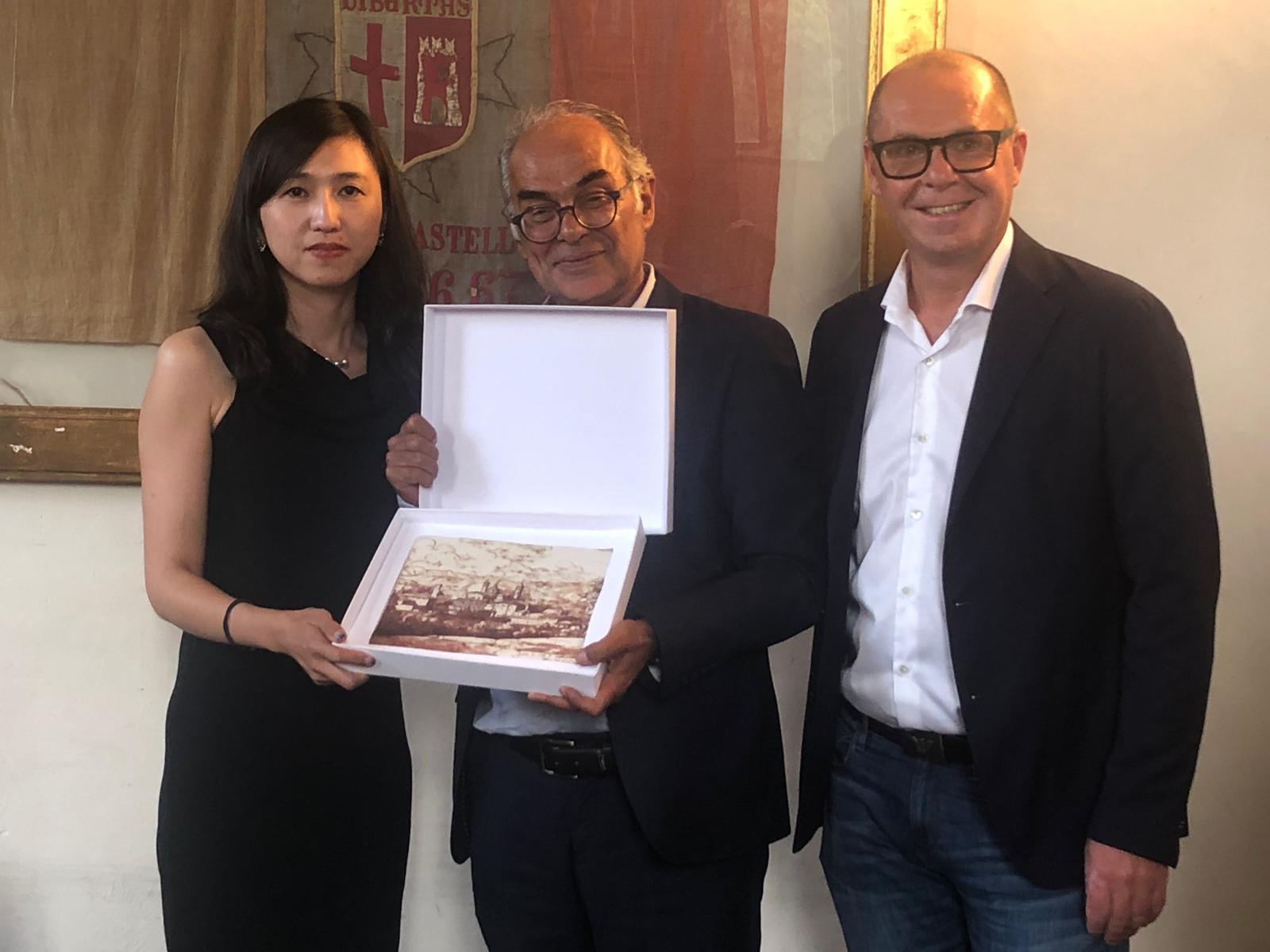 Al termine dell’incontro con la delegazione cinese, il sindaco ha fatto omaggio di volumi sulla storia della Pinacoteca e della città, di alcuni pregiati manufatti del laboratorio della Tela Umbra e di affreschi su calce: Fabre, Veduta di città di Castello, 1789, Firenze, Uffizi, realizzati dalla Bottega Tifernate di Stefano Lazzari, particolarmente apprezzati dalla delegazione diplomatica. François-Xavier Fabre è stato un pittore collezionista d’arte francese, famoso ritrattista dei poeti Vittorio Alfieri e Ugo Foscolo. In uno dei suoi viaggi in Italia, rimase incantato dallo skyline di Città di Castello, tanto da trarne un disegno che oggi si trova agli Uffizi.