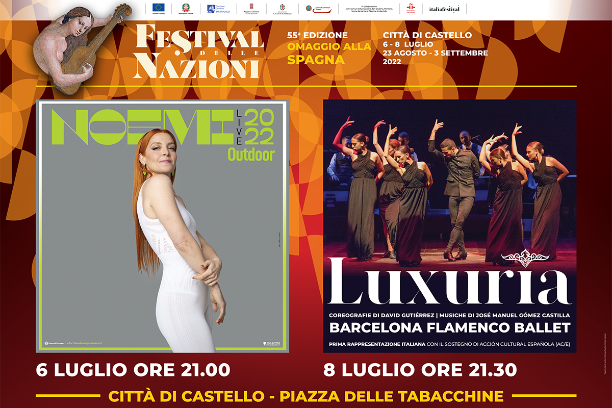 Apre la biglietteria a Città di Castello per i grandi eventi di luglio del 55° Festival delle Nazioni: per il concerto di Noemi (6 luglio) e per lo spettacolo Luxurîa della compagnia Barcelona Flamenco Ballet (8 luglio), i biglietti si possono già acquistare online ma saranno disponibili anche alla vendita cartacea a partire dal 22 giugno 2022, presso la biglietteria del Festival delle Nazioni situata nel centro storico della cittadina tifernate, in via Marconi 8a. La biglietteria sarà aperta da mercoledì fino a venerdì 8 luglio, con orario di accesso dalle 11.00 alle 13.00 e dalle 17.30 alle 19.30 (chiuso 26 giugno e 3 luglio). Contenuto il costo dei biglietti per i due eventi: 10,00 € per il terzo settore; 15,00 € per il secondo settore; 25,00 € per il primo settore.