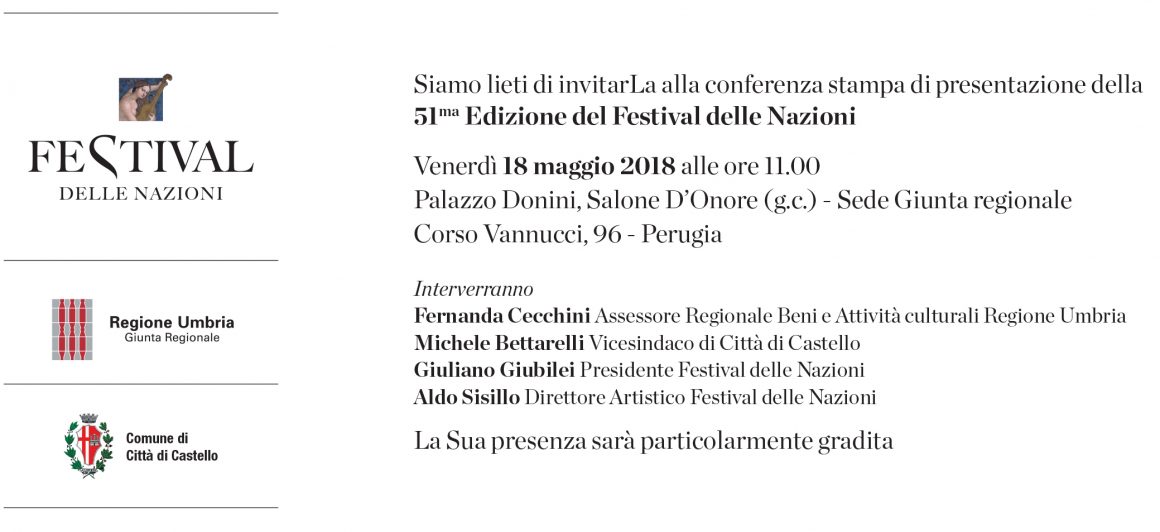 Il 18 maggio 2018 avrà luogo la conferenza stampa di presentazione del 51° Festival delle Nazioni, che si svolgerà alle ore 11.00 a Palazzo Donini a Perugia (Salone D’Onore, Sede della Giunta regionale, Corso Vannucci, 96). Nel corso della conferenza stampa sarà presentato il programma completo dell’edizione 2018 e verrà annunciata la Nazione ospite del 2019.